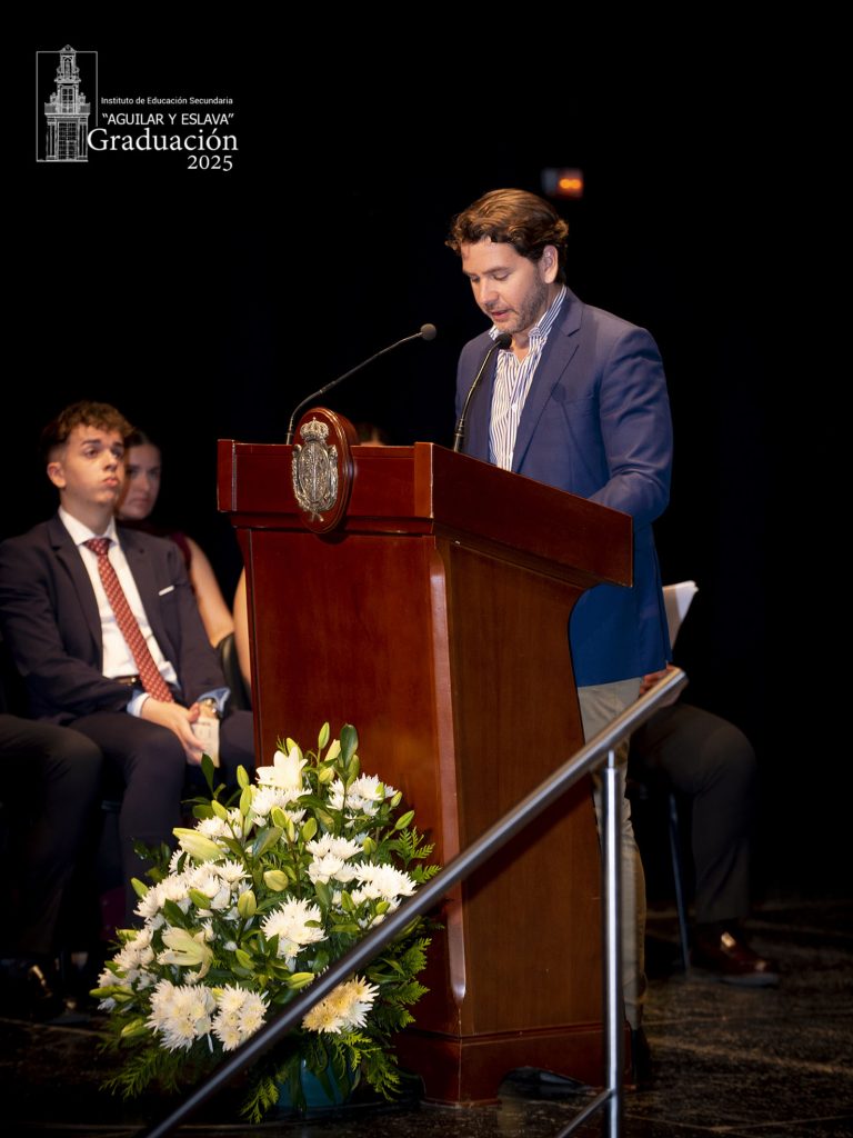 En primer lugar, el director del centro, Salvador Guzmán Moral, se dirigió a los estudiantes para dedicarles unas sentidas palabras en las que señaló que el IES Aguilar y Eslava a lo largo de su historia ha sido, es y seguirá siendo un faro de cultura y conocimiento, que hoy alumbra especialmente a los nuevos graduados. Asimismo, afirmó que la educación no es solo aprender datos, fórmulas o teorías, sino también crecer como personas, abrir la mente, cultivar el pensamiento crítico y ser capaces de construir un futuro más justo, más libre y más humano.