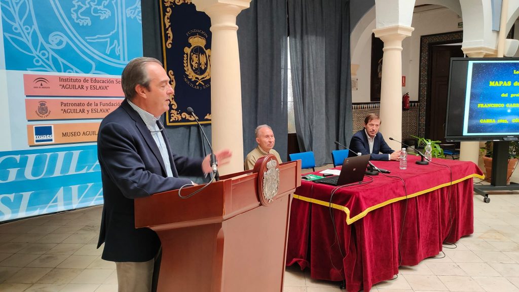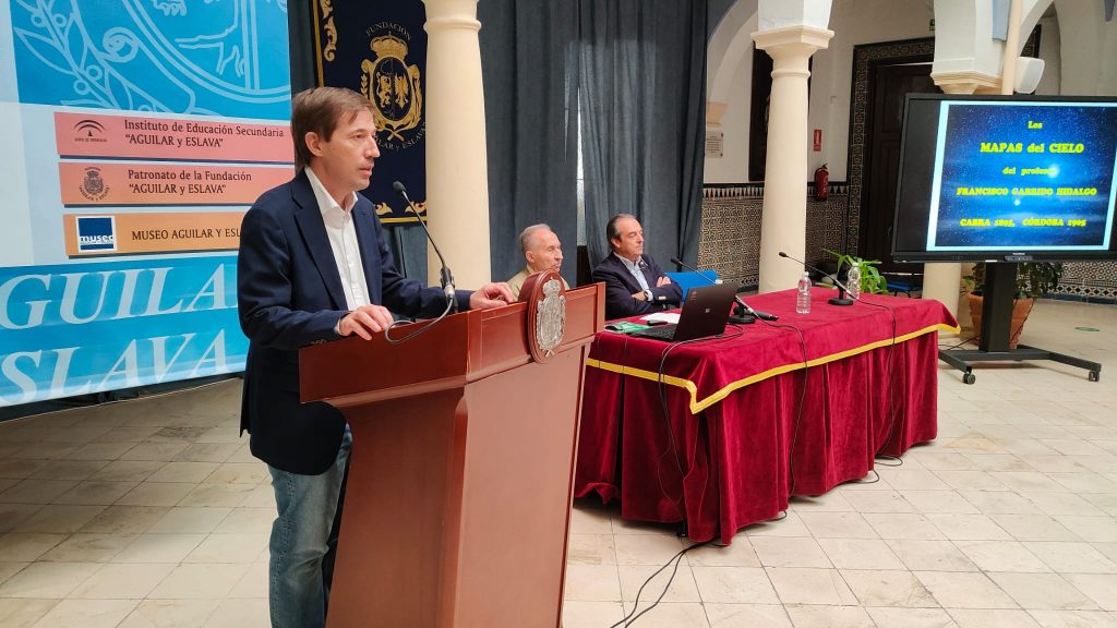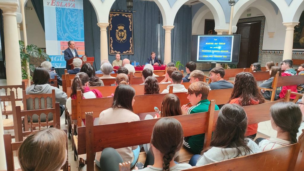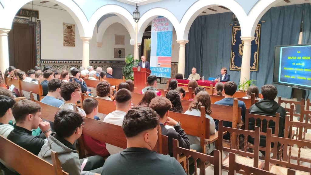 El Patio de Cristales del IES Aguilar y Eslava acogió el pasado miércoles, 12 de noviembre, la conferencia “Francisco Garrido Hidalgo (1843–1925), el profesor que pintaba… las estrellas”, impartida por el historiador José Arias Gamarra, quien fuera profesor de Geografía e Historia, tanto en los institutos de Cabra como de Córdoba. La actividad estuvo dirigida al alumnado de ESO y Bachillerato, y contó además con la presencia de invitados, antiguos alumnos y varios biznietos del profesor Garrido.
