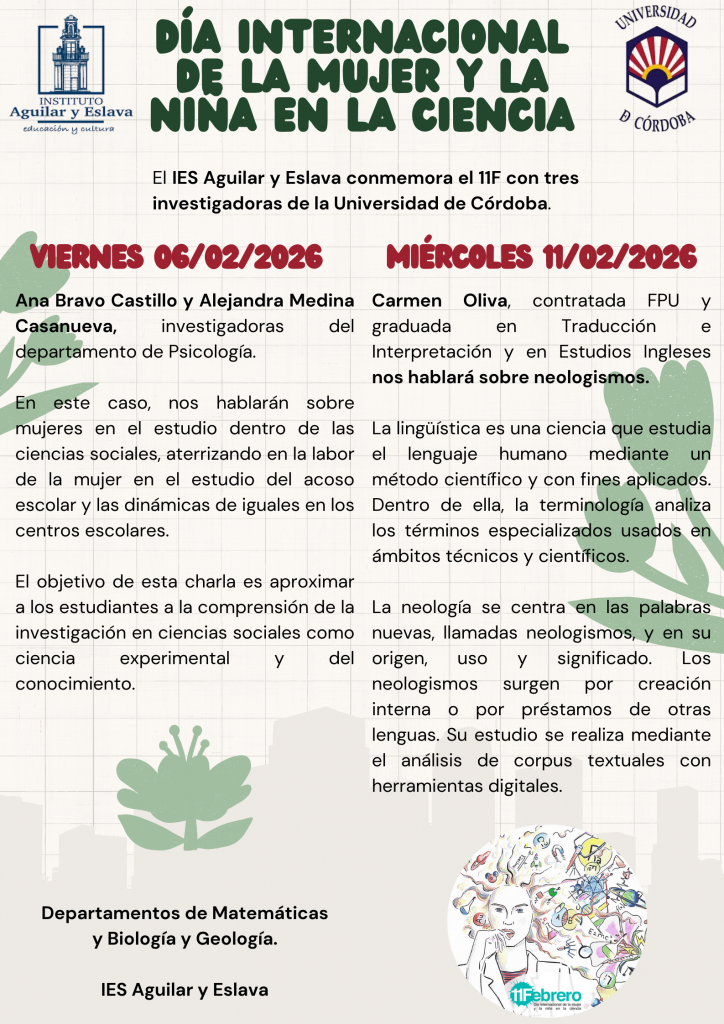 6 de febrero de 20266 de febrero de 2026 Comments 0 Feedbacks on “DÍA INTERNACIONAL DE LA MUJER Y LA NIÑA EN LA CIENCIA”Uncategorized by Equipo directivo IES Aguilar y Eslava