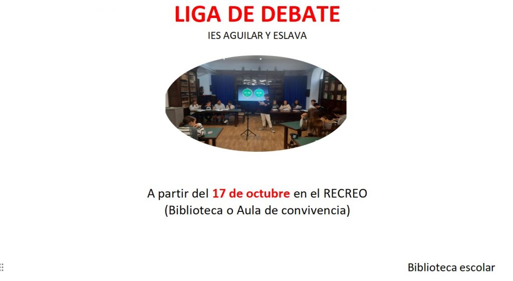 Desde la materia de Oratoria y debate y la Biblioteca Escolar se vuelve a poner en marcha la Liga de debate académico para este curso, en el que los equipos inscritos podrán elegir debatir entre deporte, las protestas propalestinas y las redes sociales, así como cualquier otro tema que decidan conjuntamente los equipos.
