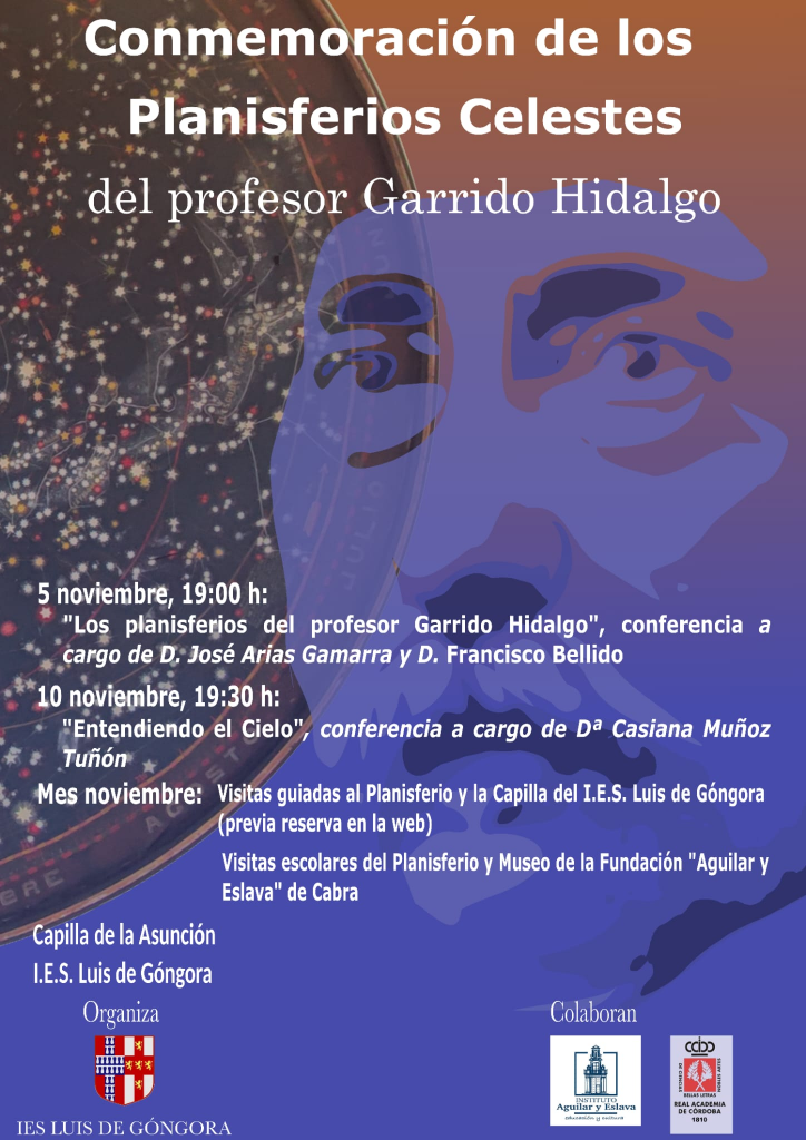 Asimismo, el IES Luis de Góngora acogerá durante el mes de noviembre el ciclo ‘Conmemoración de los Planisferios Celestes del profesor Garrido Hidalgo’, que incluye las conferencias: ‘Los planisferios del profesor Garrido Hidalgo’, a cargo de José Arias Gamarra y Francisco Bellido, el 5 de noviembre, y ‘Entendiendo el Cielo’, por Casiana Muñoz Tuñón, profesora de la Universidad de La Laguna y directora de investigación del Instituto de Astrofísica de Canarias, prevista para el 10 de noviembre. Completando también su programa de actividades con visitas guiadas al planisferio y a la Capilla de la Asunción del instituto.