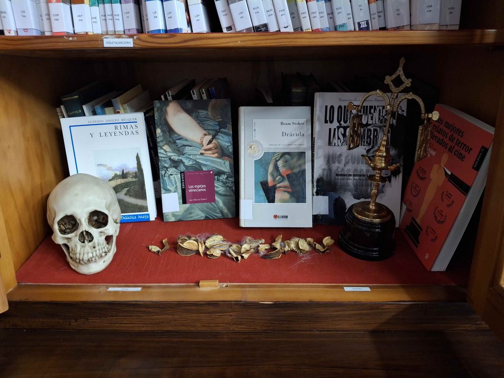 Del 27 de octubre al 31 de octubre, desde la Biblioteca escolar, se ha realizado una selección de libros de terror, con la exposición de un rincón temático con los libros y con fragmentos de las obras, para que quien lo visite pueda leer y conocer un poco de ellos. Entre los títulos destacados, se encuentran las Leyendas de Gustavo Adolfo Bécquer, Drácula de Bram Stoker, Los espejos venecianos de Joan Manuel Gisbert, Los mejores relatos de terror llevados al cine de varios autores, y Lo que cuentan las sombras de Francisco J. Segovia Ramos, entre otras. En inglés, recomendamos The picture of Dorian
