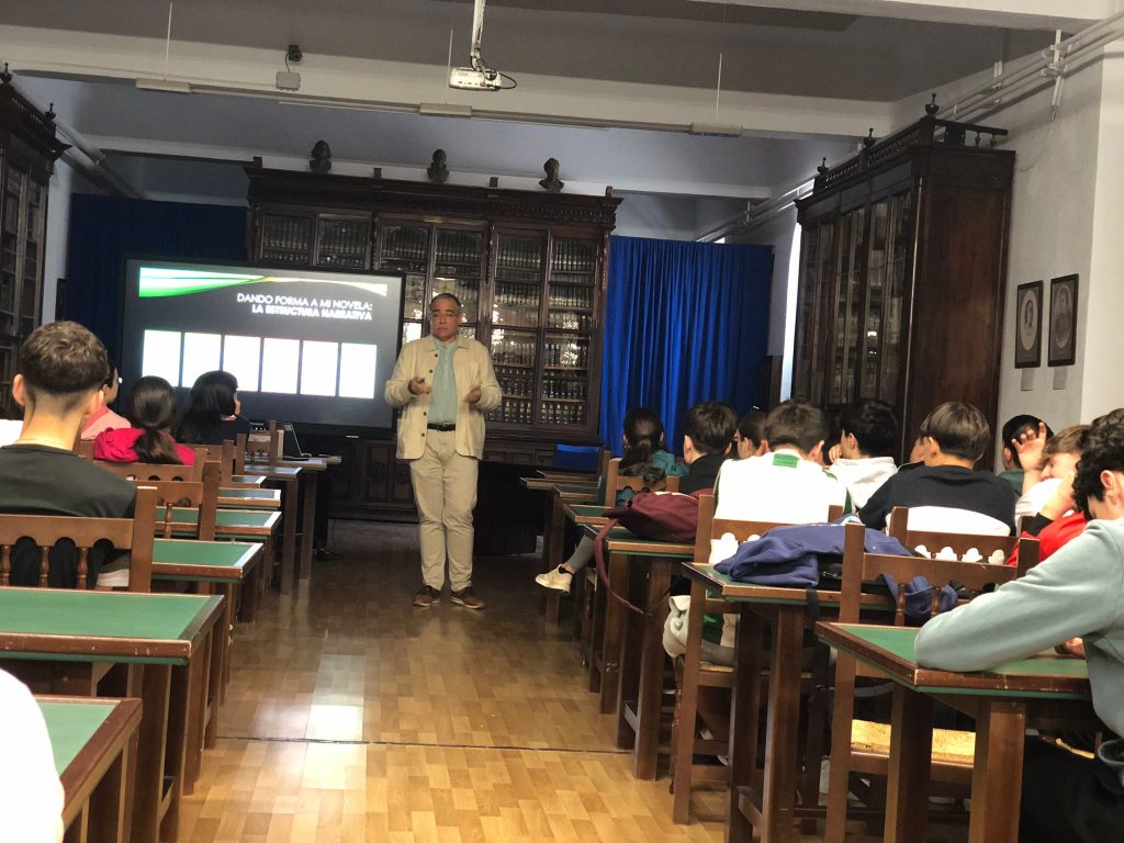 Durante su participación le habló a la juventud de la manera de contar historias y se centró principalmente en cómo lo hacía en las novelas para concretar, en especial, las historias de héroes; así, a partir del personaje del héroe, explicó el esquema o el patrón que siguen y las posibles modificaciones que se pueden encontrar en él. Sin duda, la actividad de este escritor fue muy positiva y sirvió para analizar, reflexionar y alentar la creación literaria entre el alumnado.